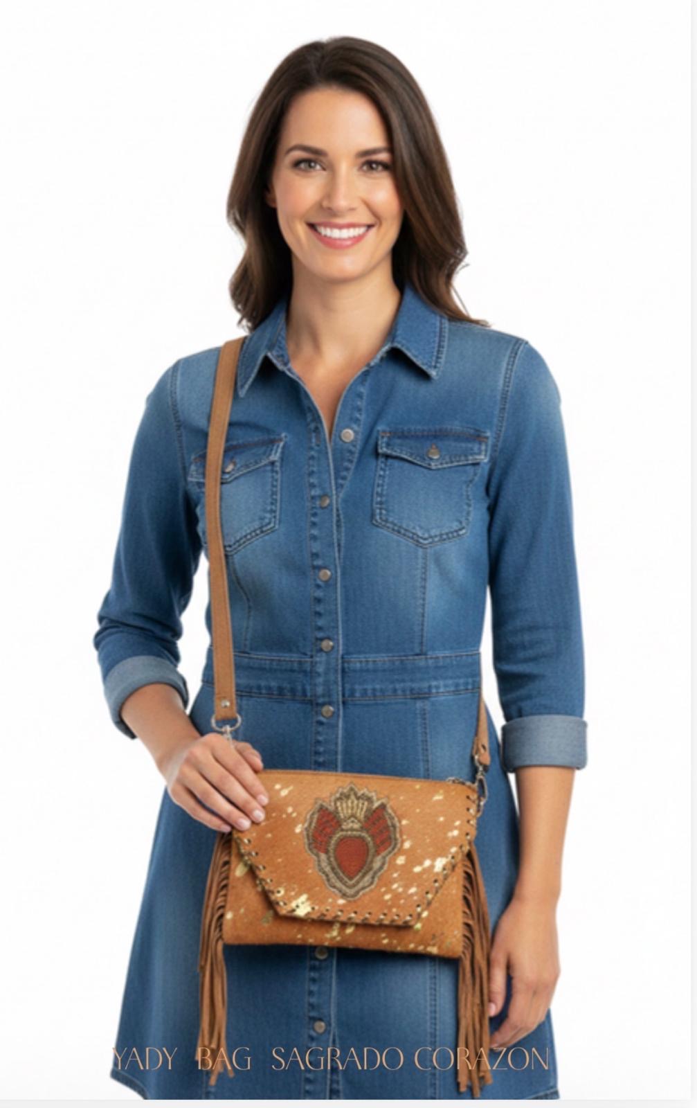 Cartera en Leather, flecos, Diseño de corazón en piedras, 8”